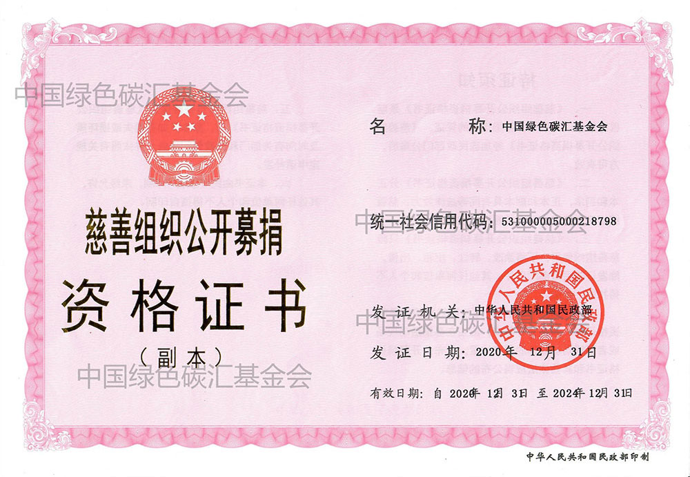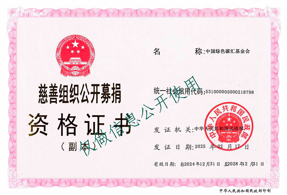 中国绿色碳汇基金会经民政部认定为慈善组织并获得公开募捐资格。