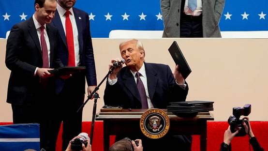 2025年1月20日星期一,唐纳德·特朗普总统在华盛顿特区第一资本竞技场举行的唐纳德·特朗普总统就职游行中签署的一堆行政命令发表评论。(Sam Greene-Pool来自Imagn Images)
